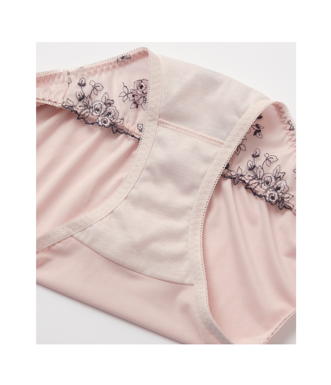 ・フロントはラメ糸入りのローズ柄刺しゅうレースに、コットン混生地を裏打ちして透け感をやわらげる