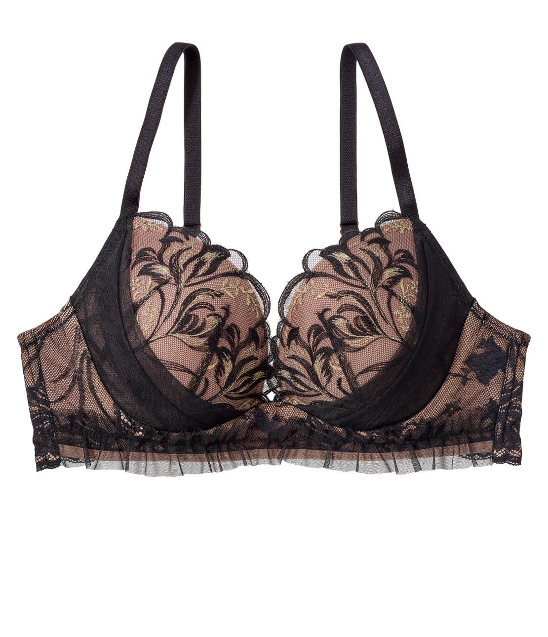 ・ラメ糸入りの刺しゅうレースでカップをカバー。曲線的なフラワー柄が優美に引き立つ