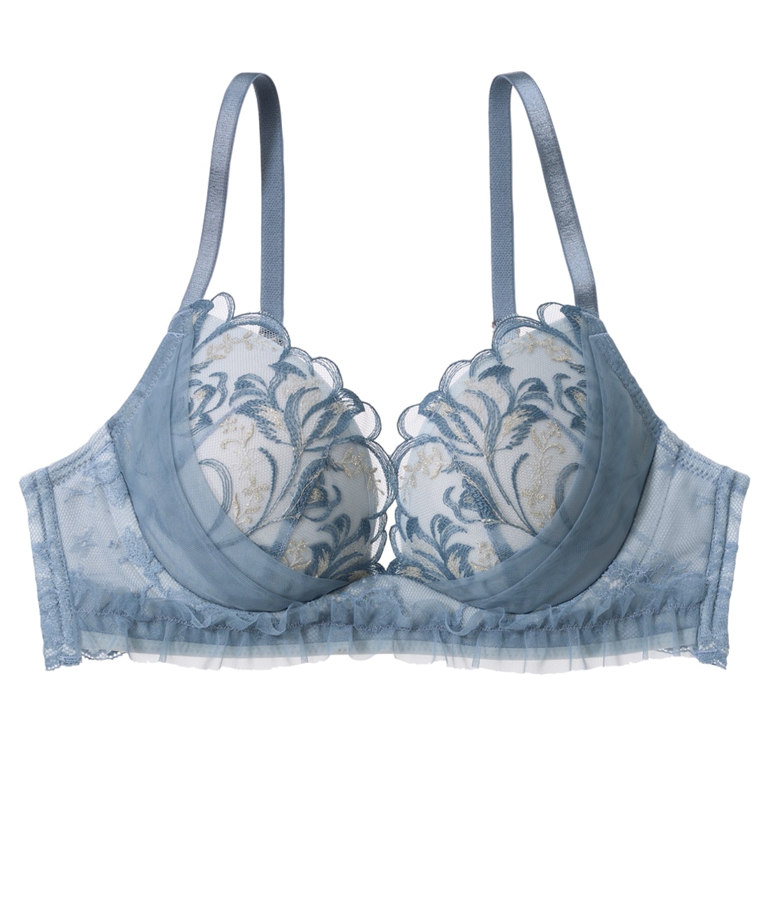 ・ラメ糸入りの刺しゅうレースでカップをカバー。曲線的なフラワー柄が優美に引き立つ