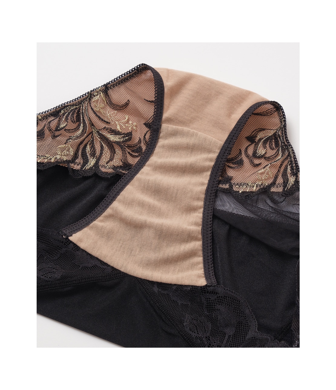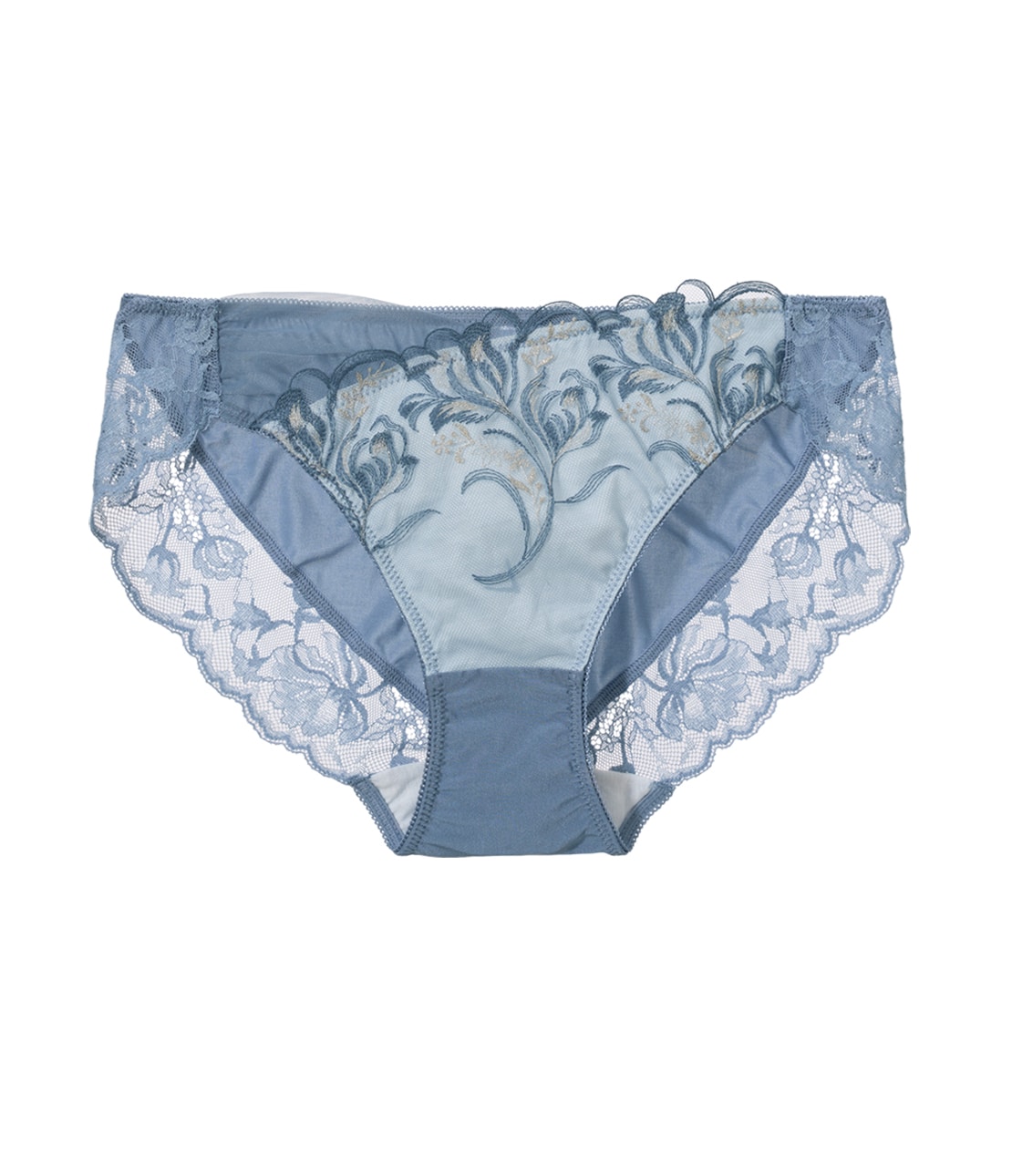 ・脚ぐりをストレッチレースに切り替え、ソフトなはき心地。柄行きもスカラップも美しく、後ろ姿にもフェミニンなポイント。