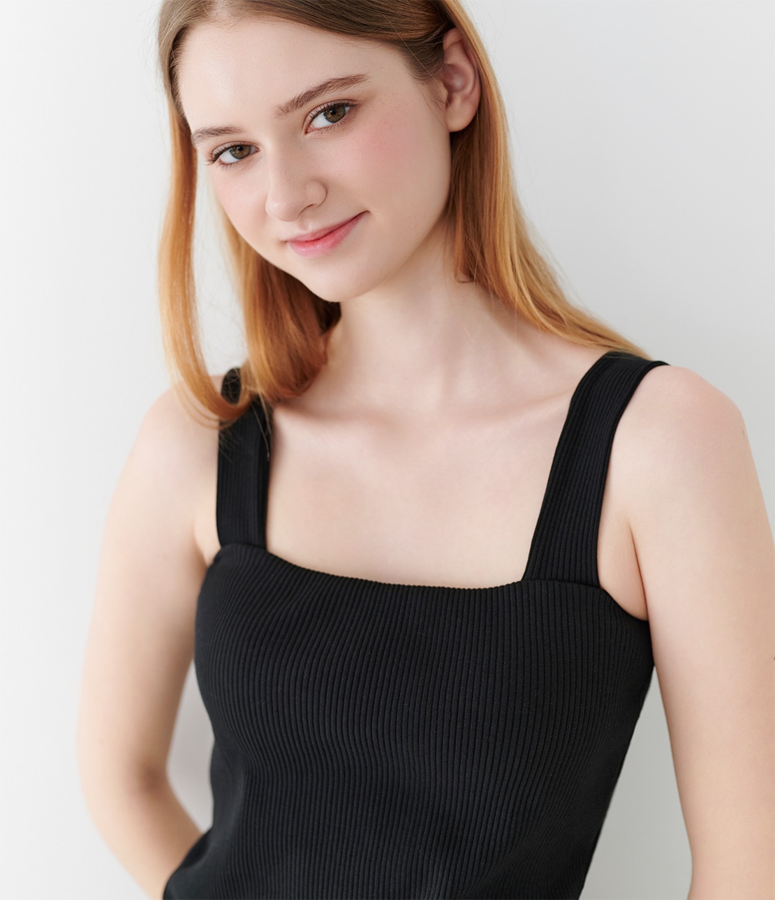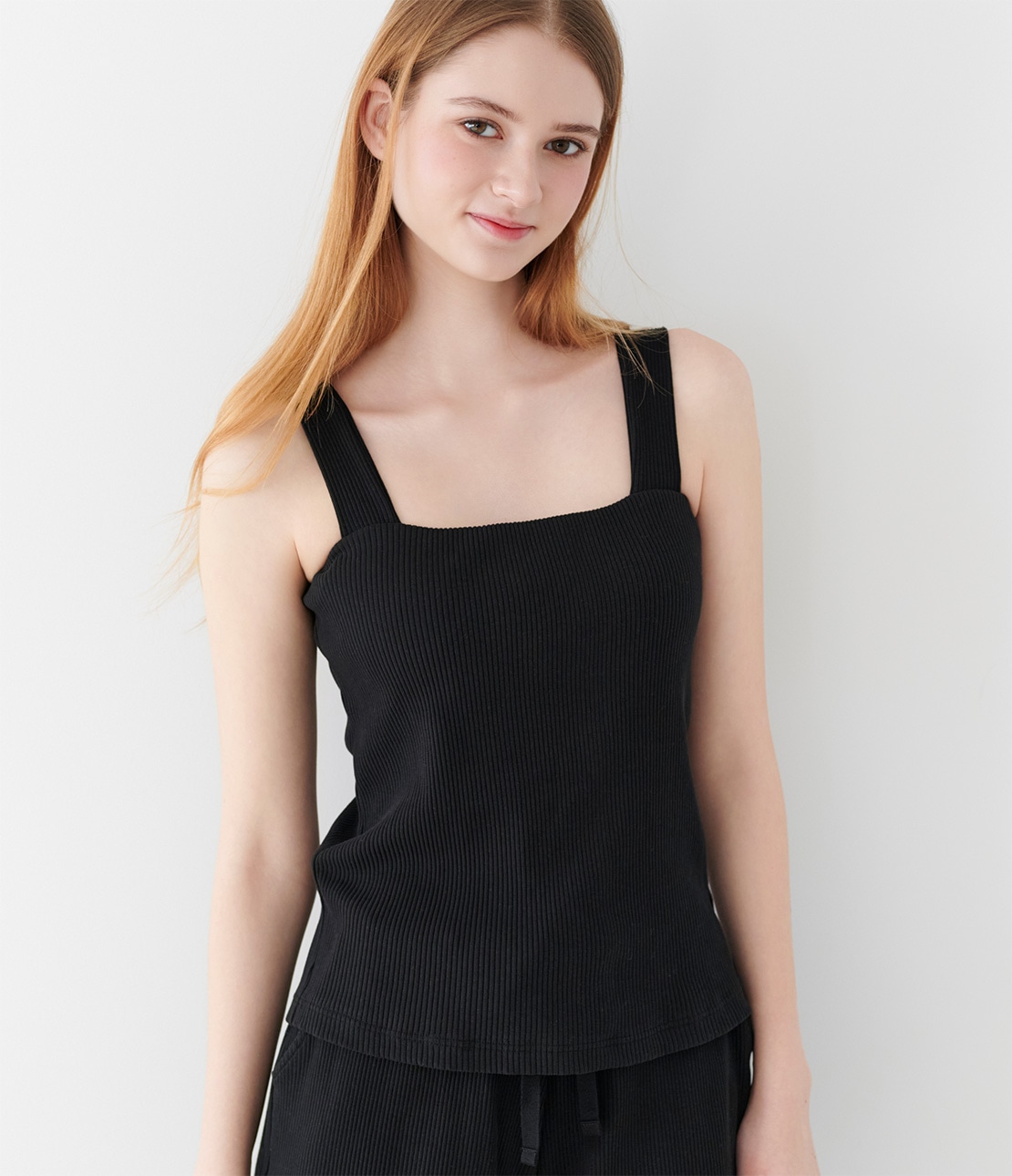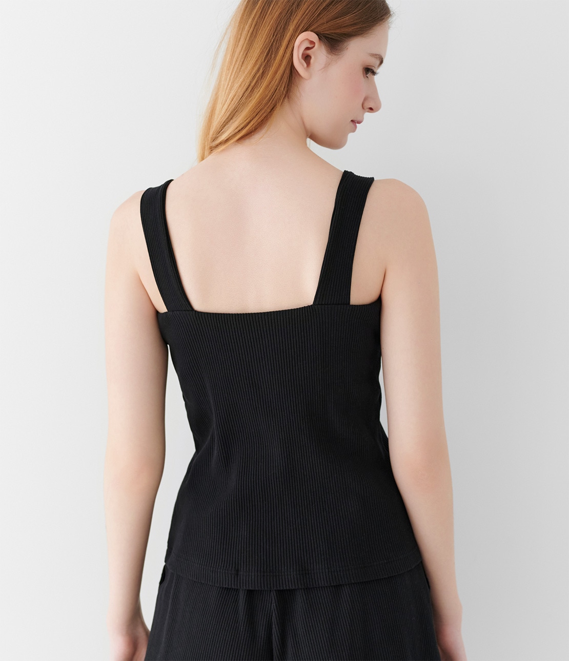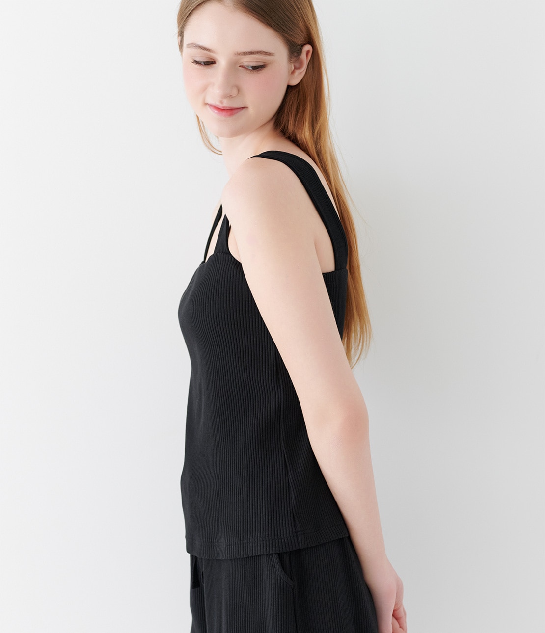 谷間を隠すネックラインで1枚着しやすい。コットン混リブのブラタンクトップ。