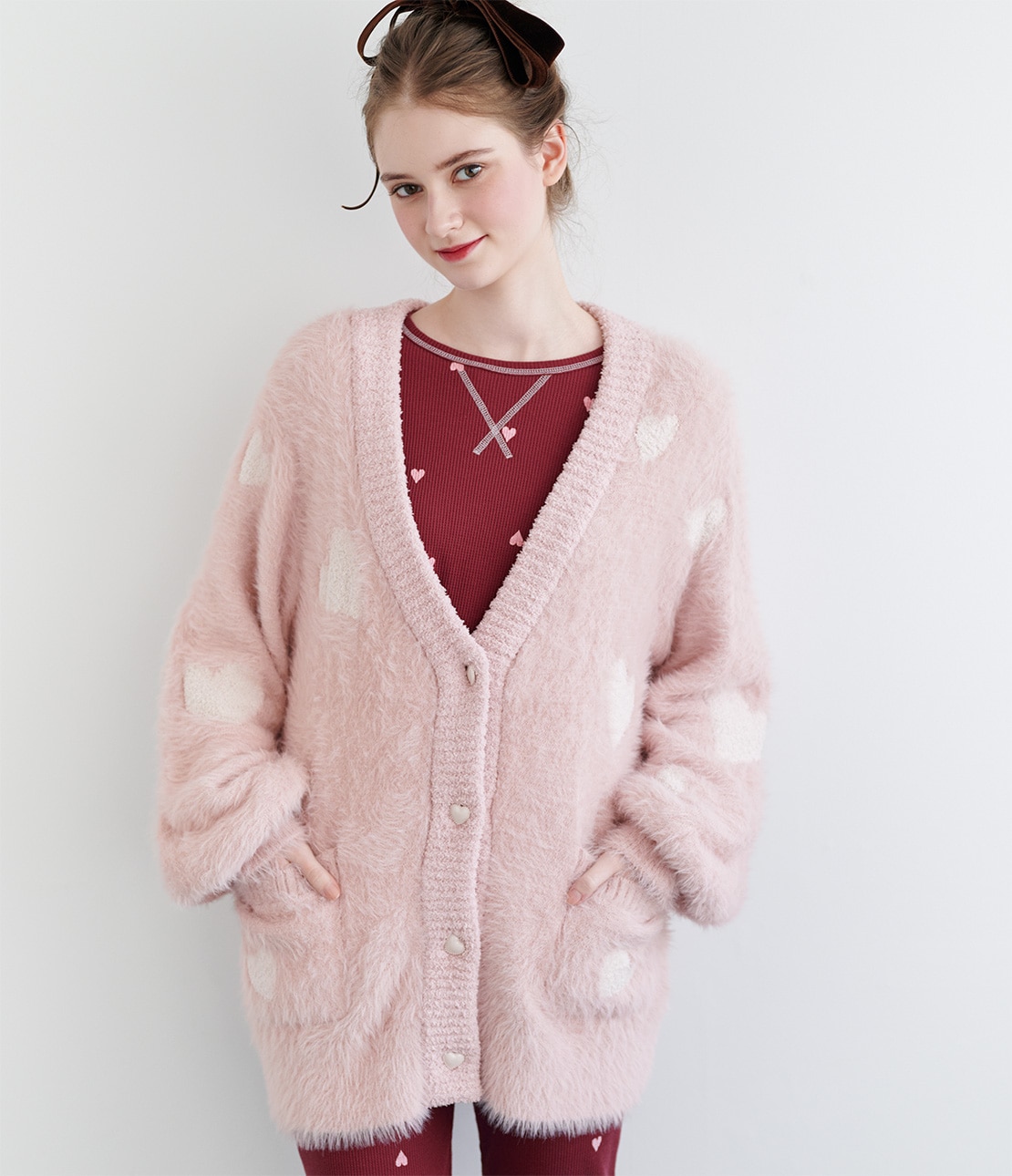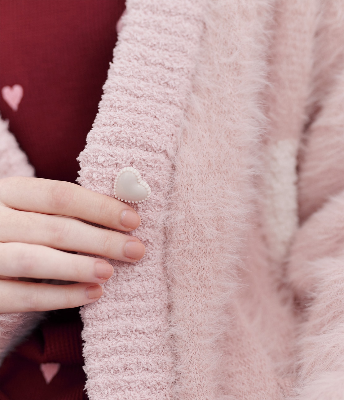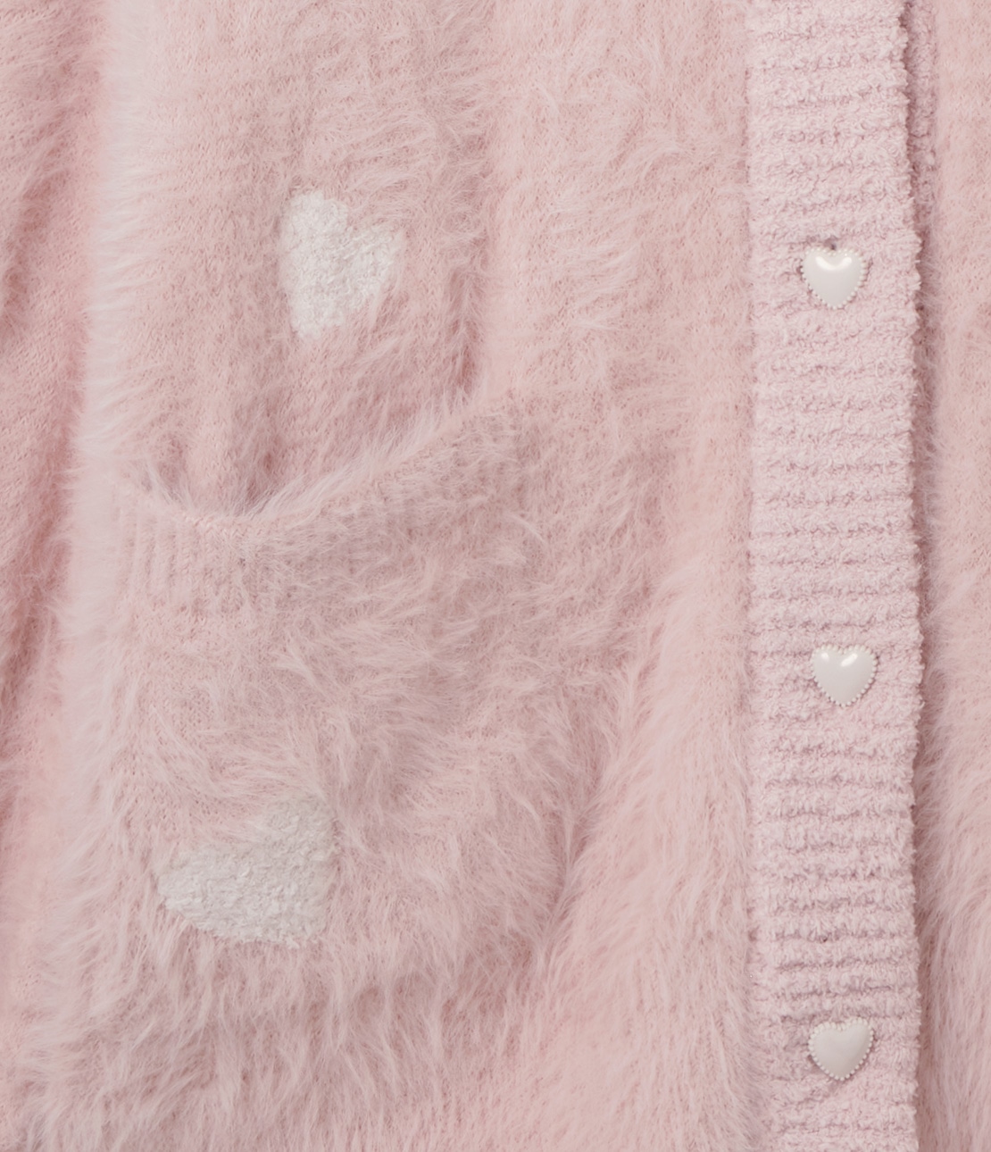 ベースカラーはいちごミルクのような優しいピンクで、ハート柄とボタンはオフホワイト。