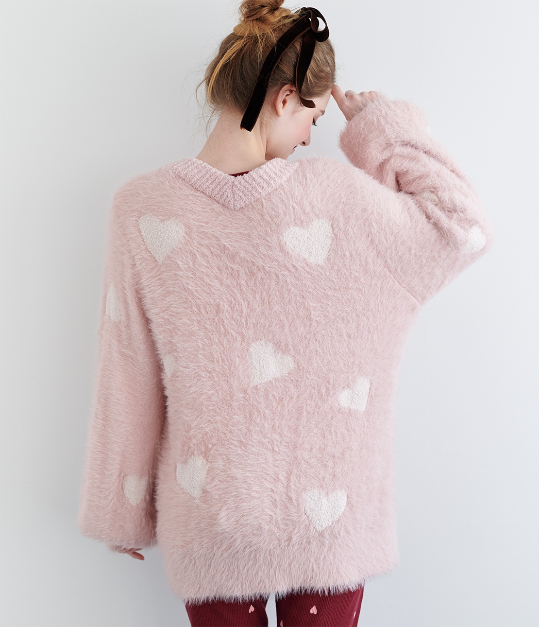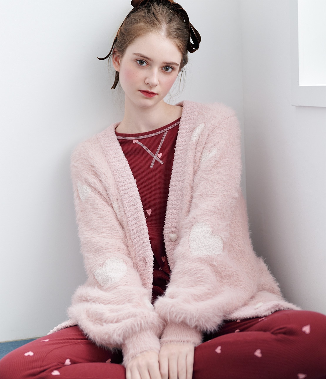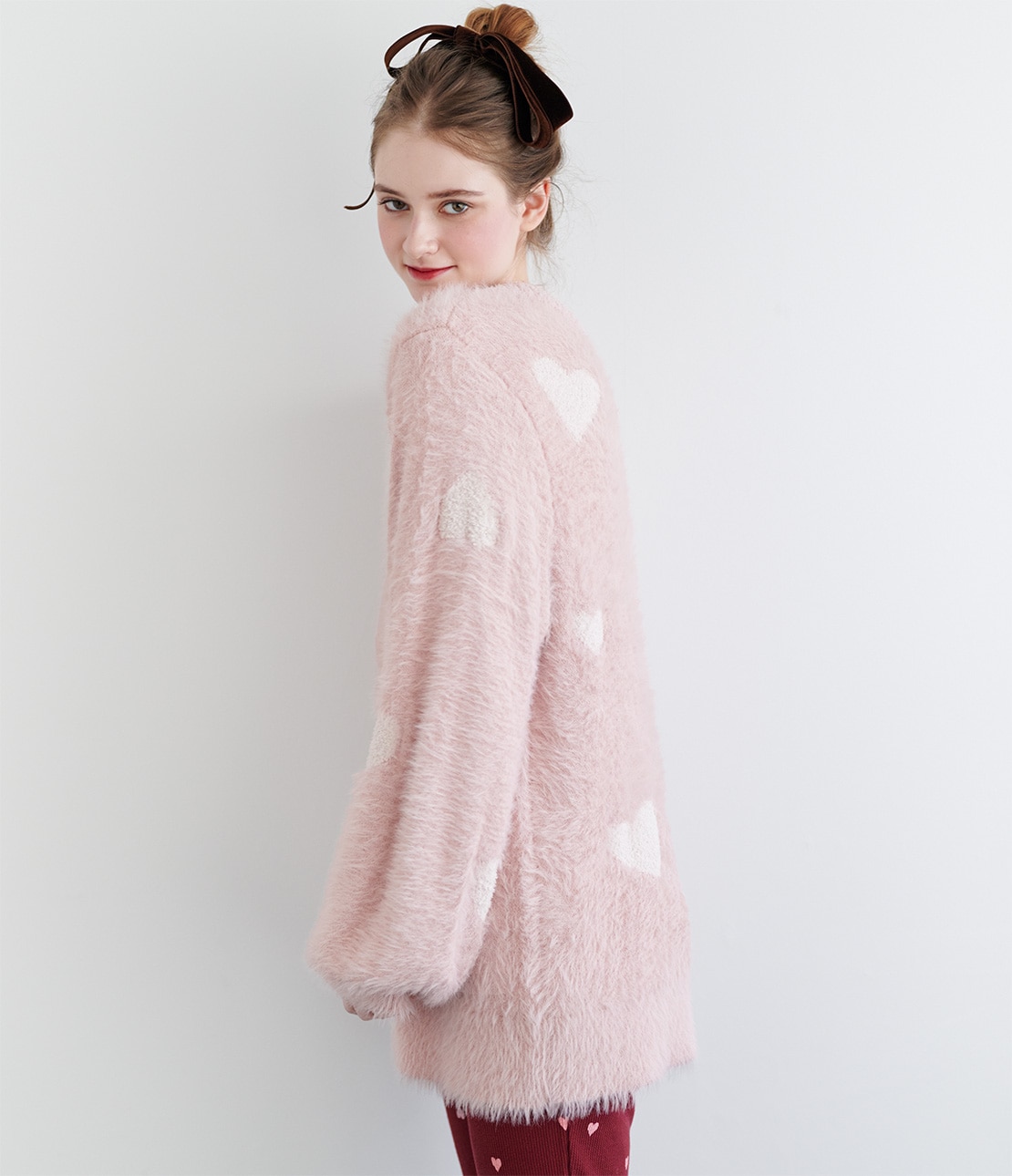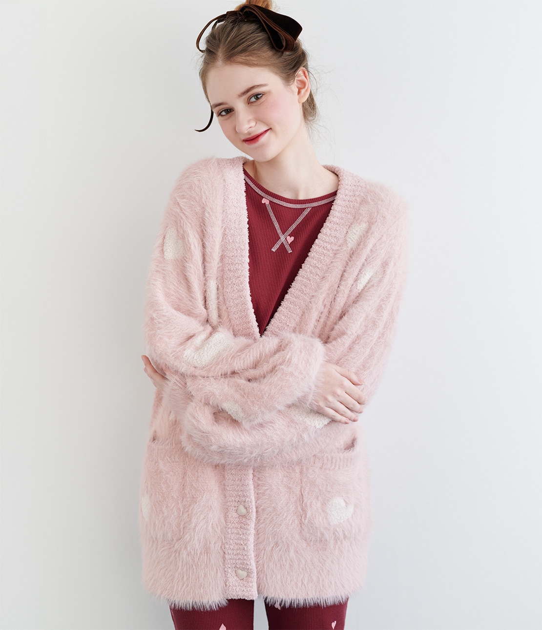 ベースカラーはいちごミルクのような優しいピンクで、ハート柄とボタンはオフホワイト。