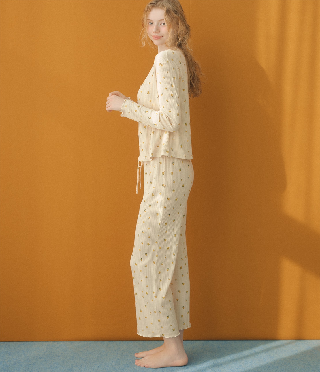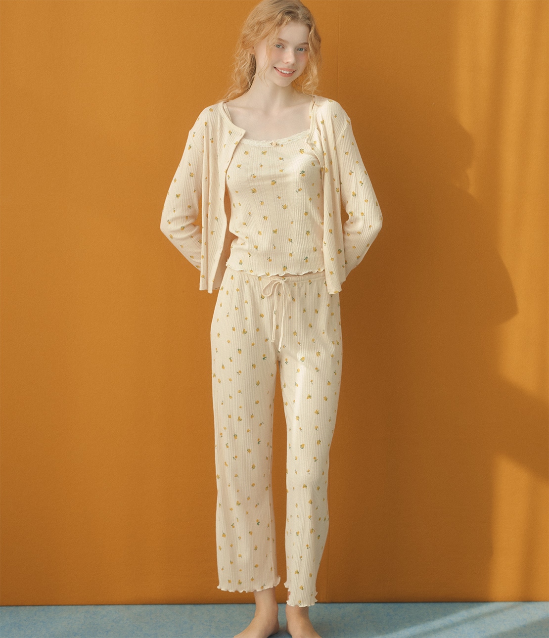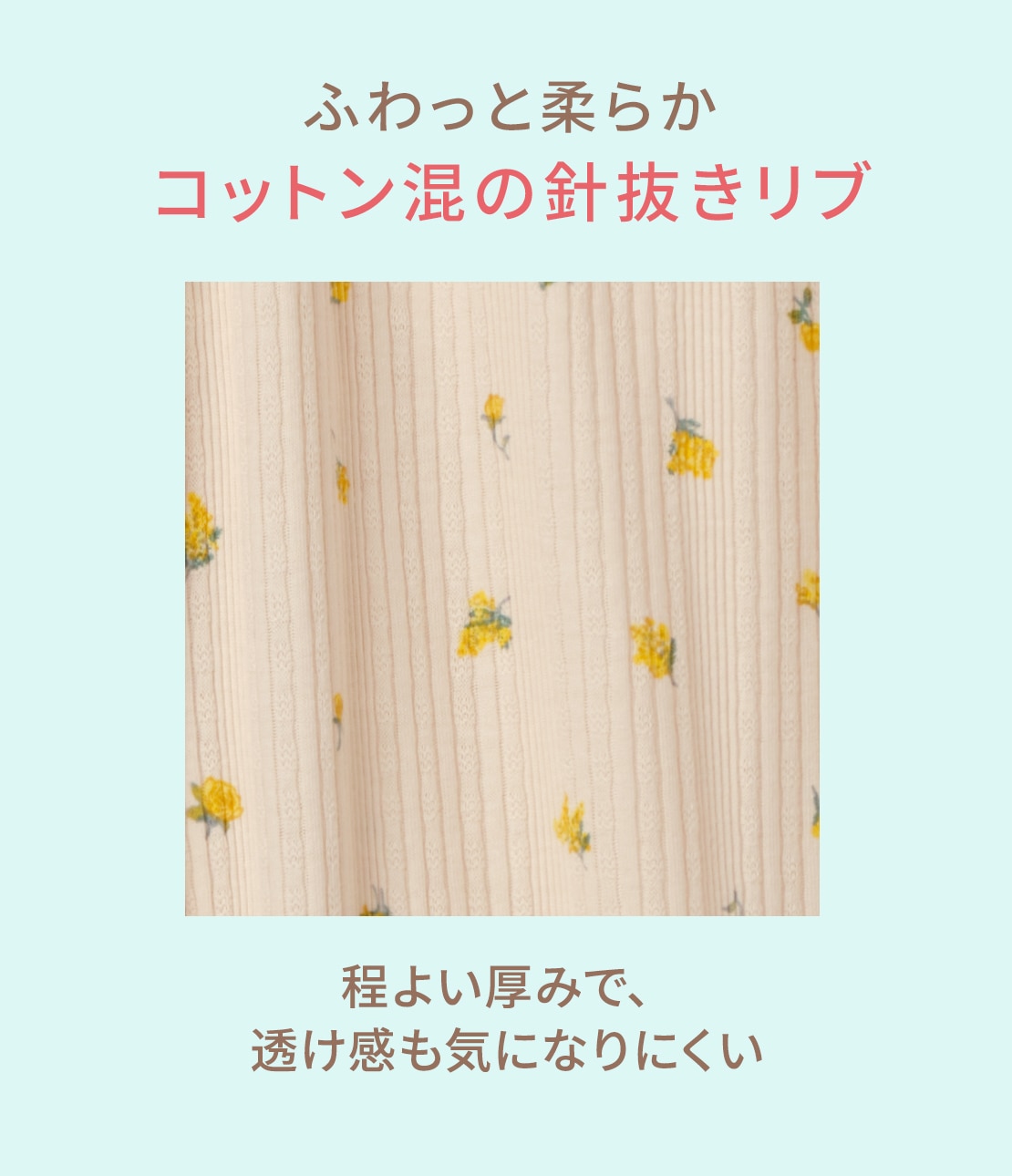 夏も活躍!小花柄に癒やされる、柔らかコットン混リブのルームウェア3点セット。
