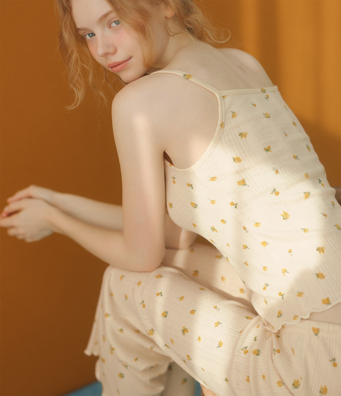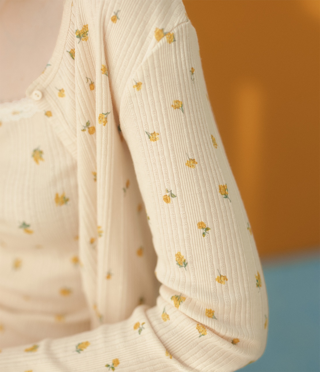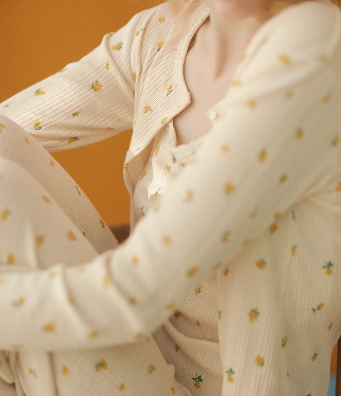 夏も活躍!小花柄に癒やされる、柔らかコットン混リブのルームウェア3点セット。