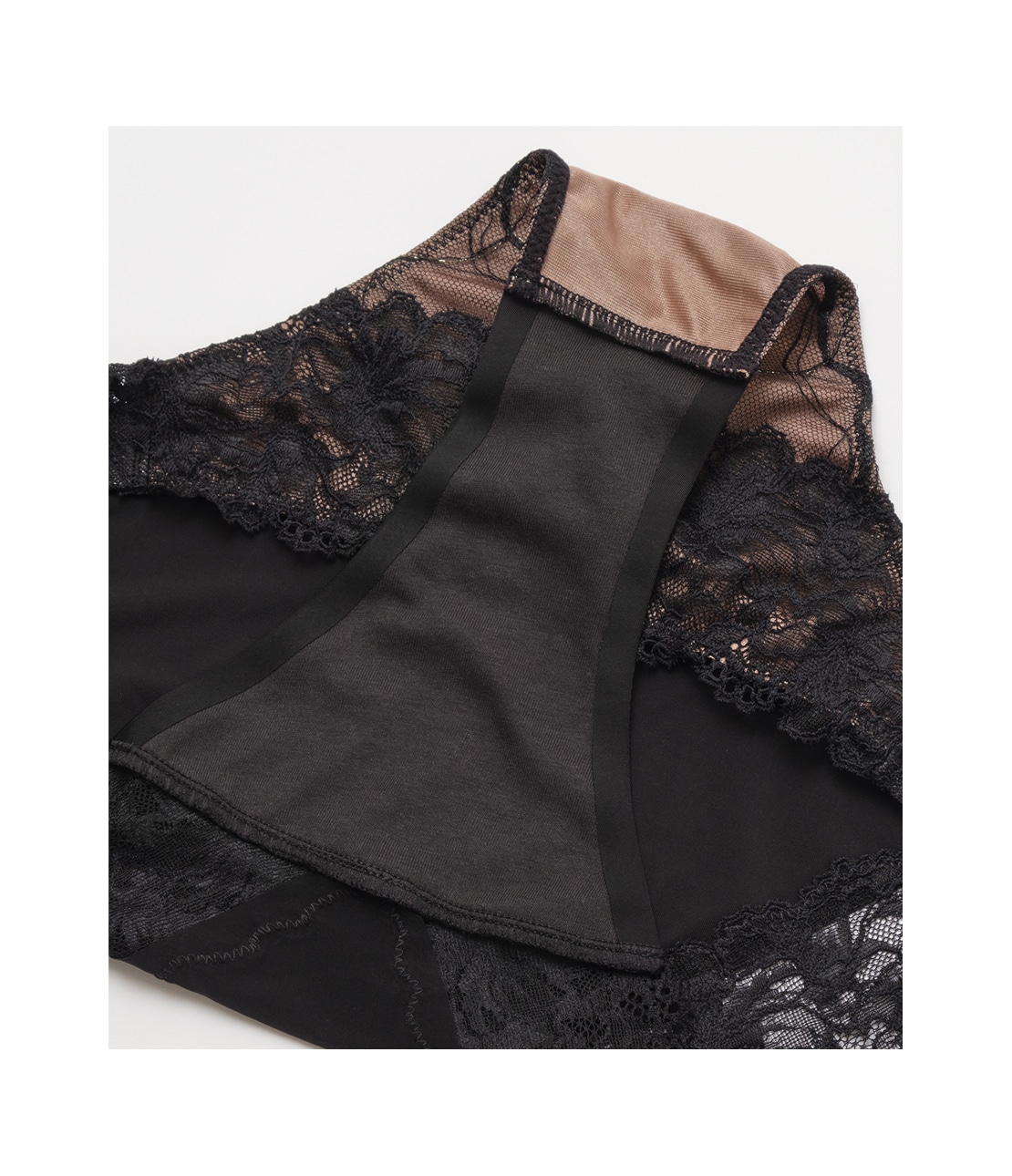 ・フロント全面に配色の薄手生地を裏打ち。レース柄を引き立て、肌が透けるのを緩和。