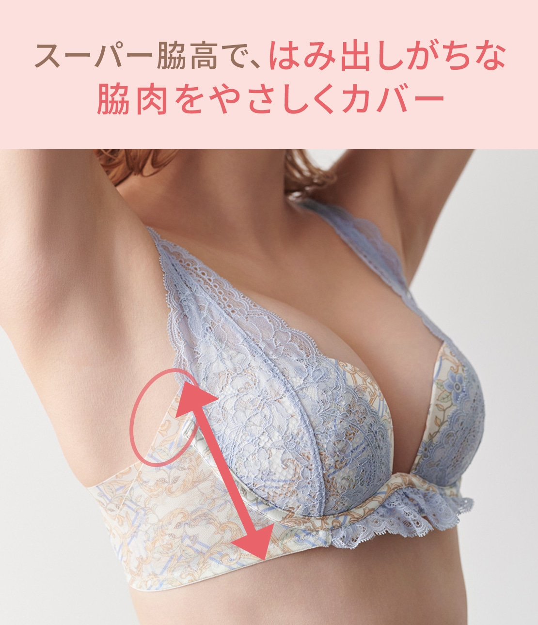 ・超脇高設計で脇肉をしっかりホールドしつつも、苦しくない着け心地。