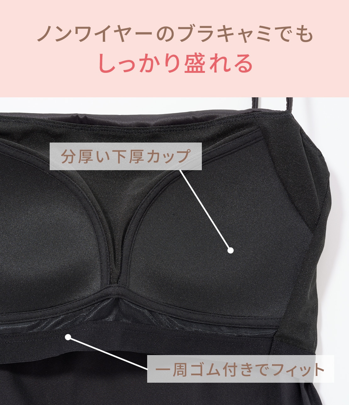 ・サイド~下側が分厚いカップ付きで、バストをしっかりボリュームアップ。ノンワイヤー。