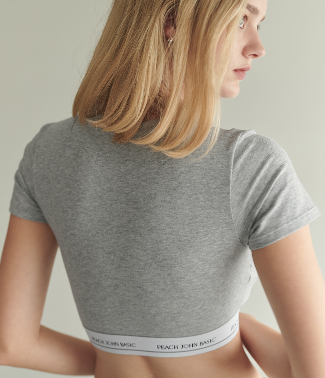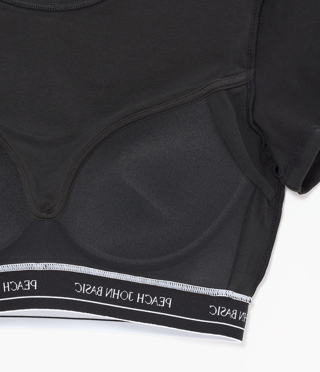 ・下辺(アンダーバスト)は一周、「PEACH JOHN BASIC」のロゴが入った幅広ゴムテープ。伸びも戻りも良く、心地よいフィット感