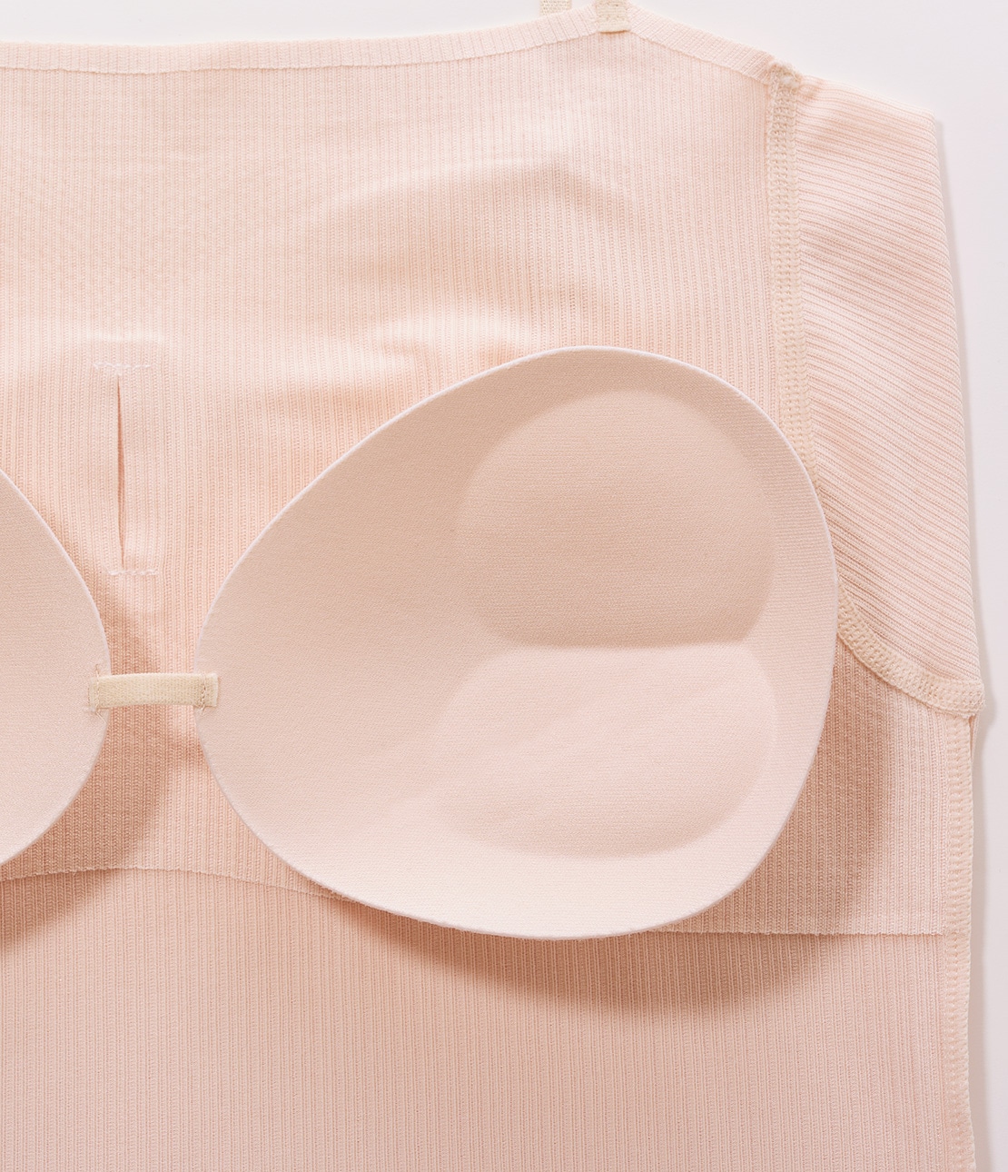 ・バスト部に共生地のパッドポケット付きで、左右がつながったパッド入り。取り外し可。