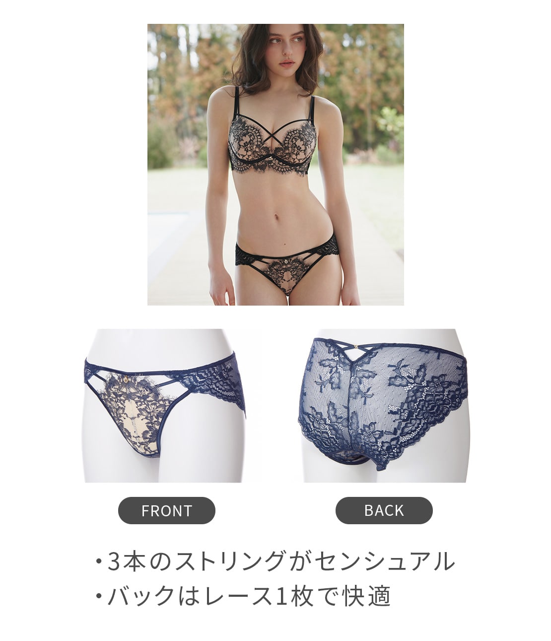 ・フロントは配色のライニングに、ツートーンのアイラッシュレースを重ねて柄がくっきりと映える