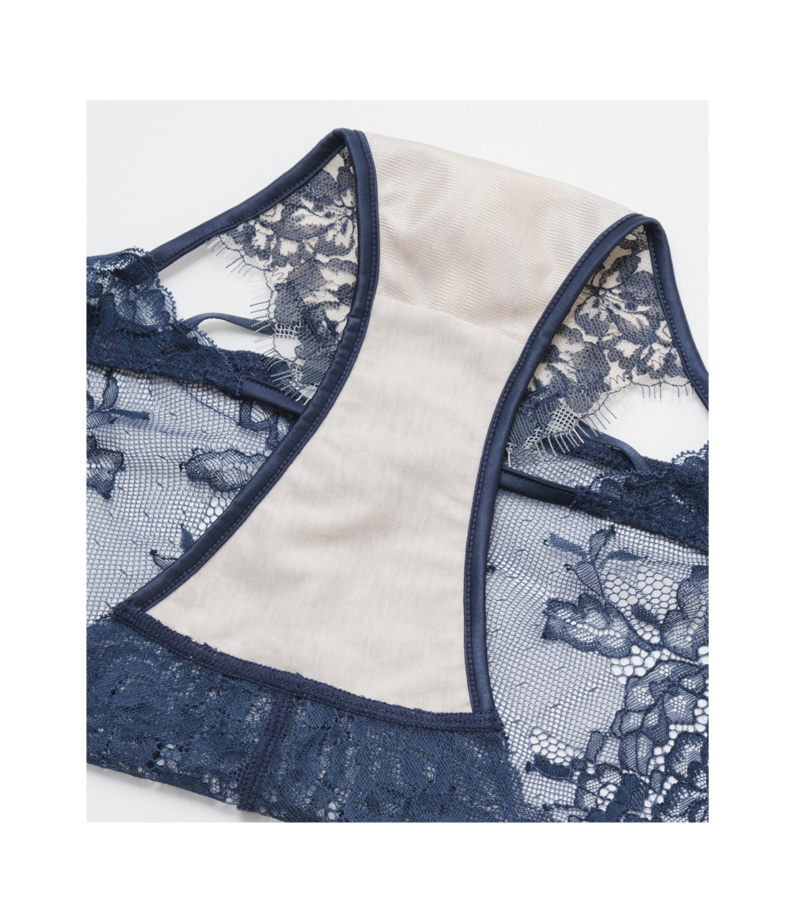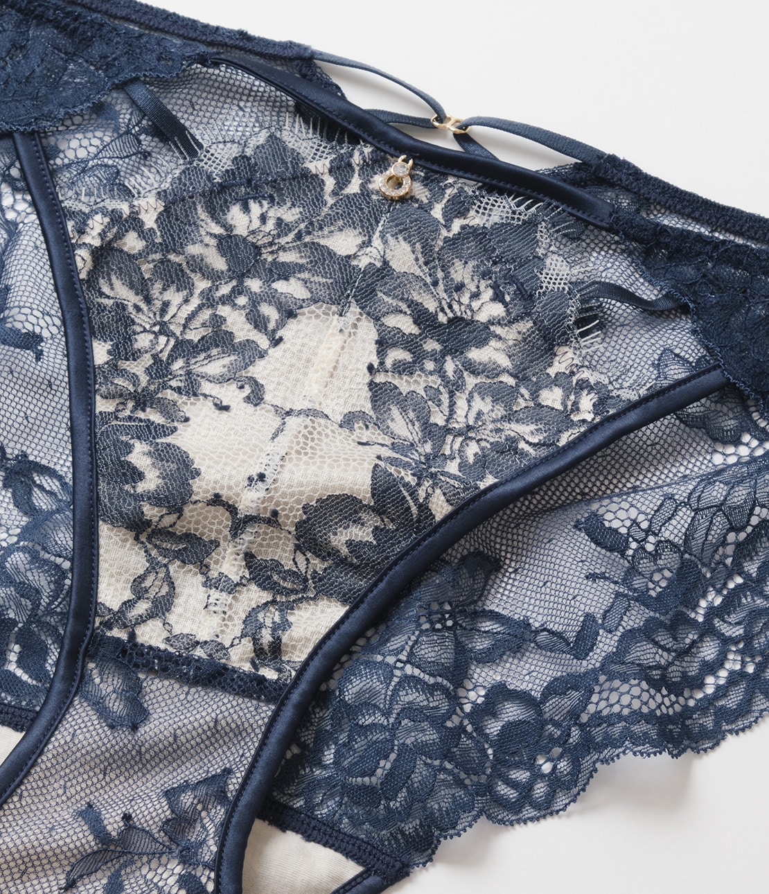 ・中央はツートーンのアイラッシュレースに配色の薄手生地を裏打ちし、透け感を軽減。