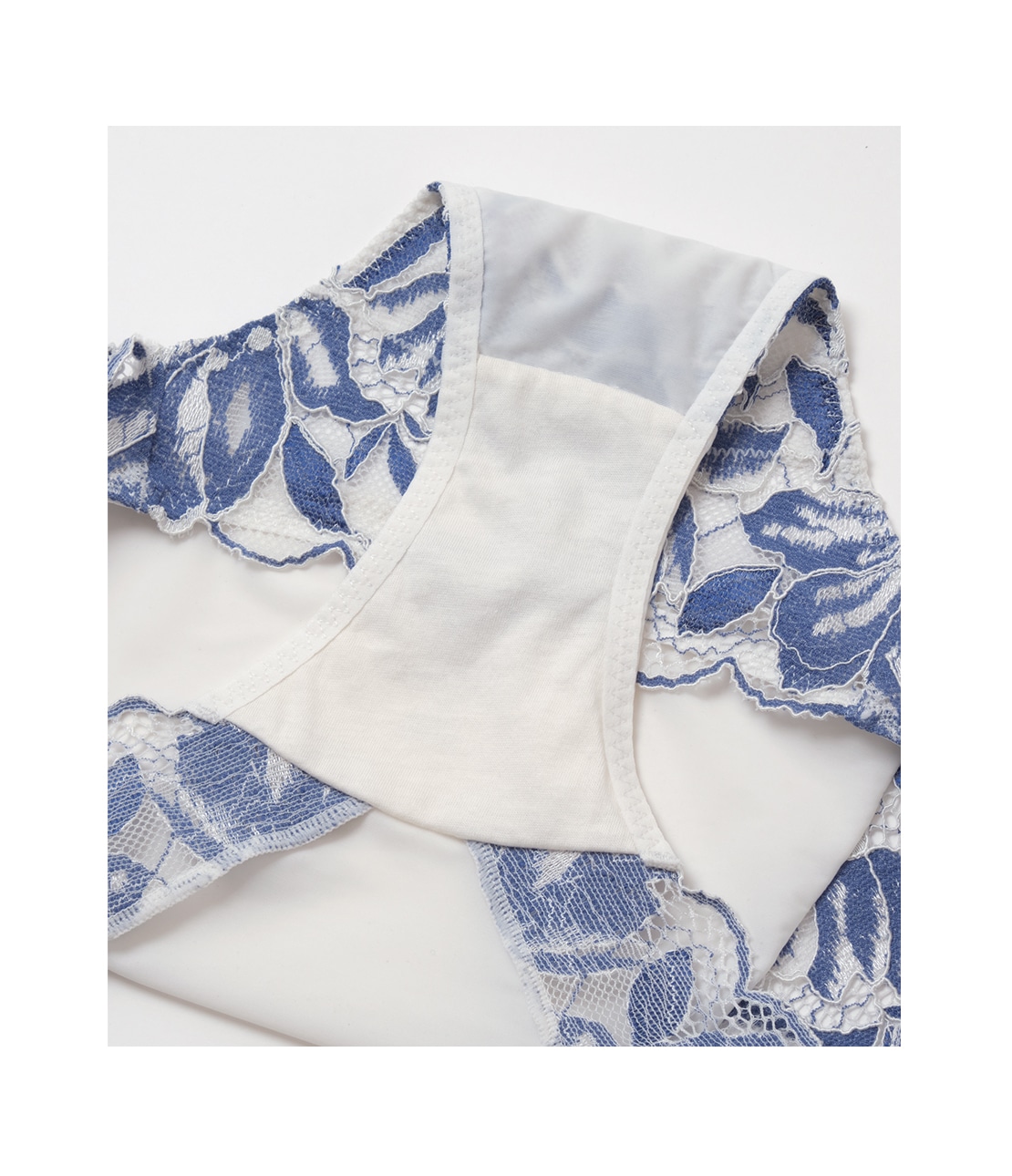 ・両サイドからバック脚ぐりにかけては広幅のストレッチレース。ゴム不使用で肌当たりがやさしい。