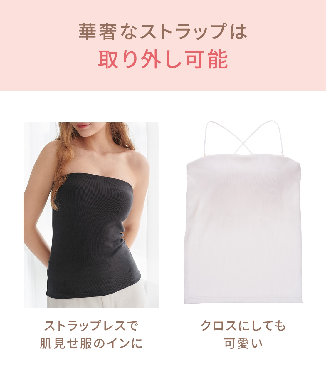 ・肩ひもを外して、ストラップレスでも着用できるブラチューブ。