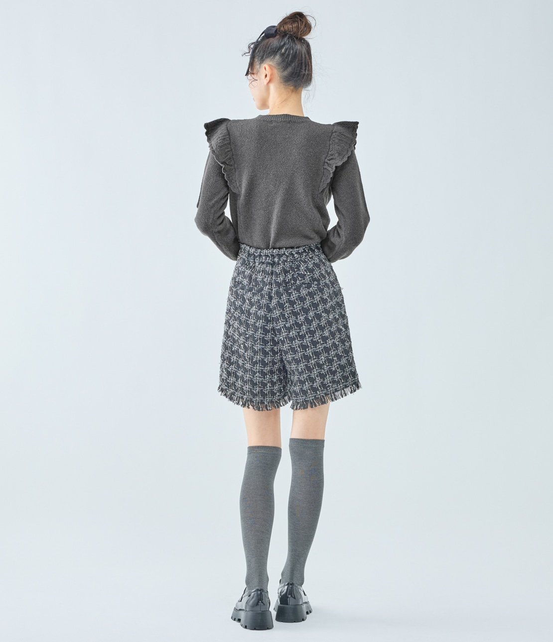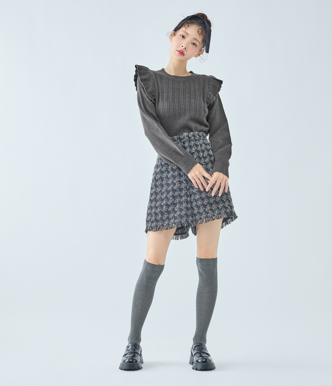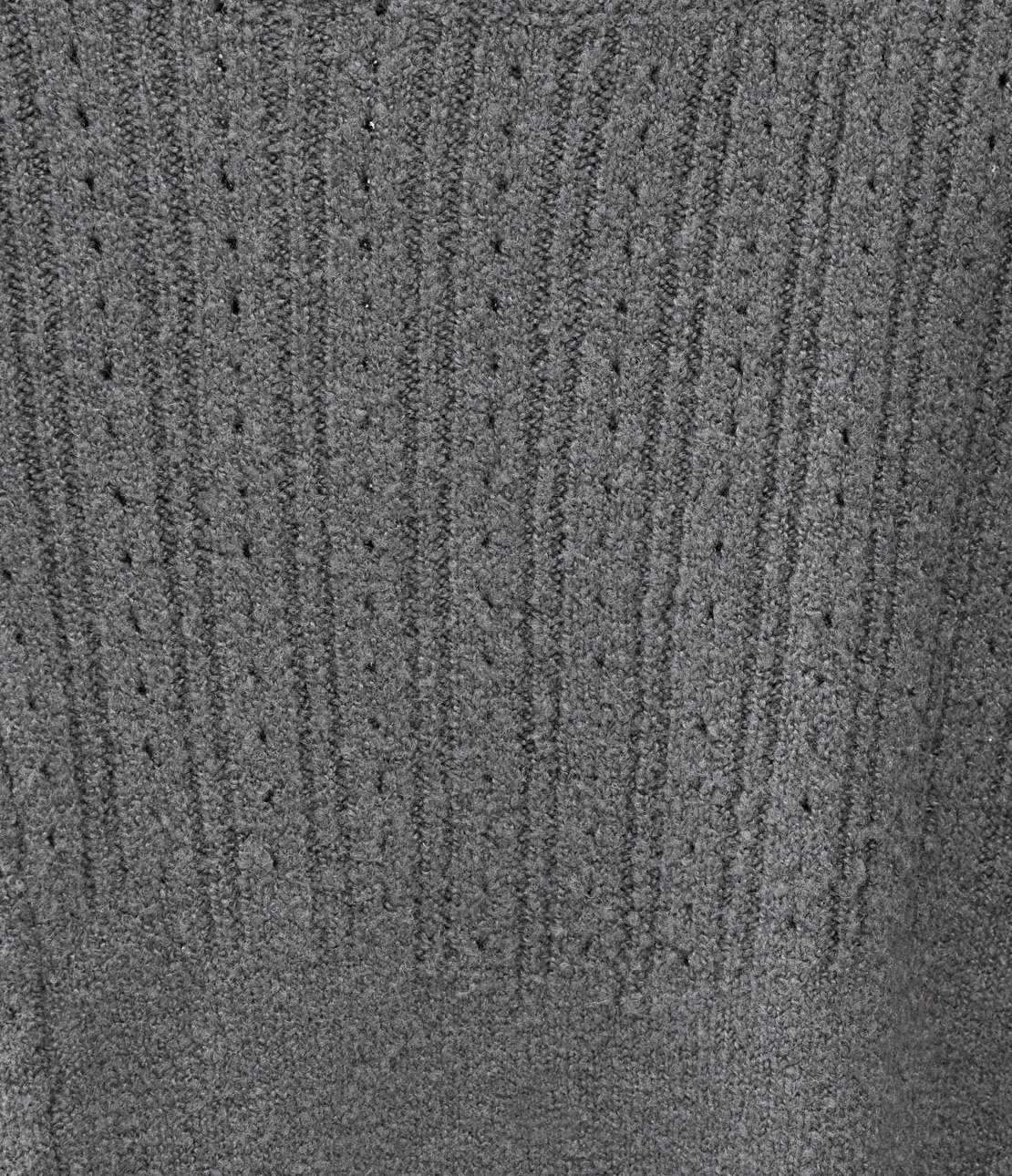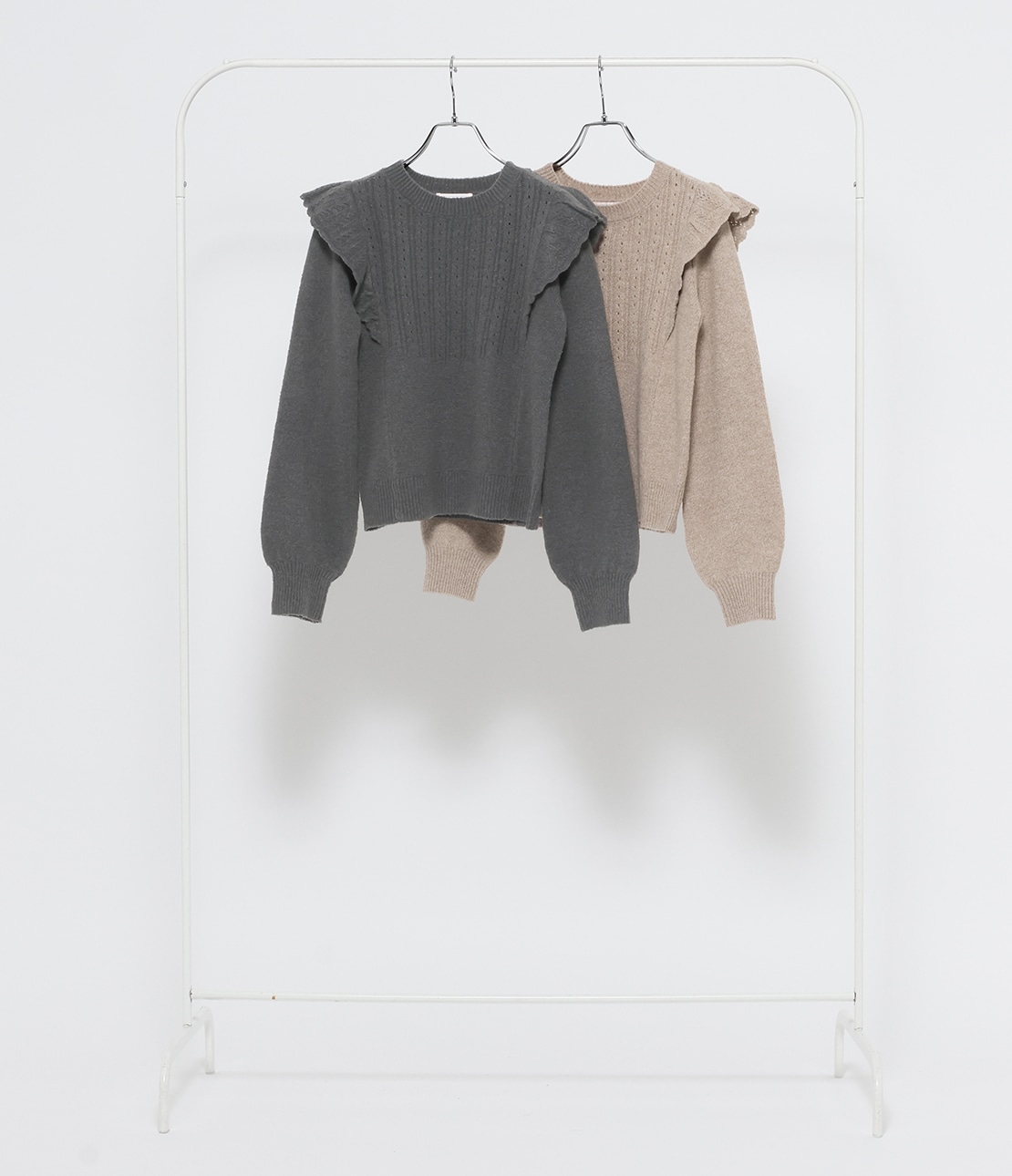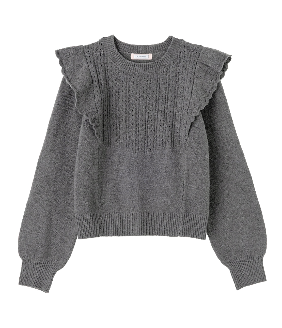 肩部分から身頃にかけた透かし編みのフリルが特徴的なニットトップス。バスト部分のアイレットリブ編みが、目を引くポイントになっています。ふっくらした温かみのあるバルキーな表面感で、フェミニンさのあるアイテムです。