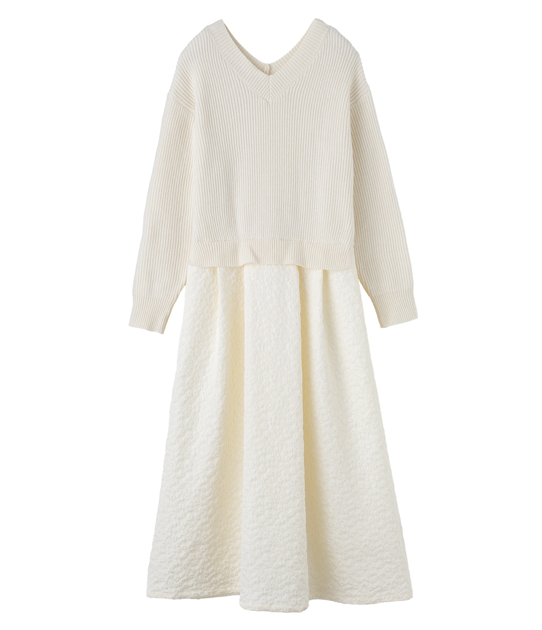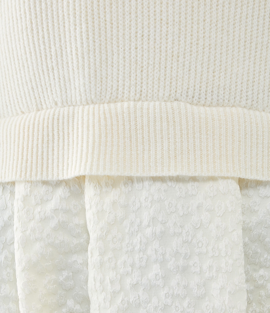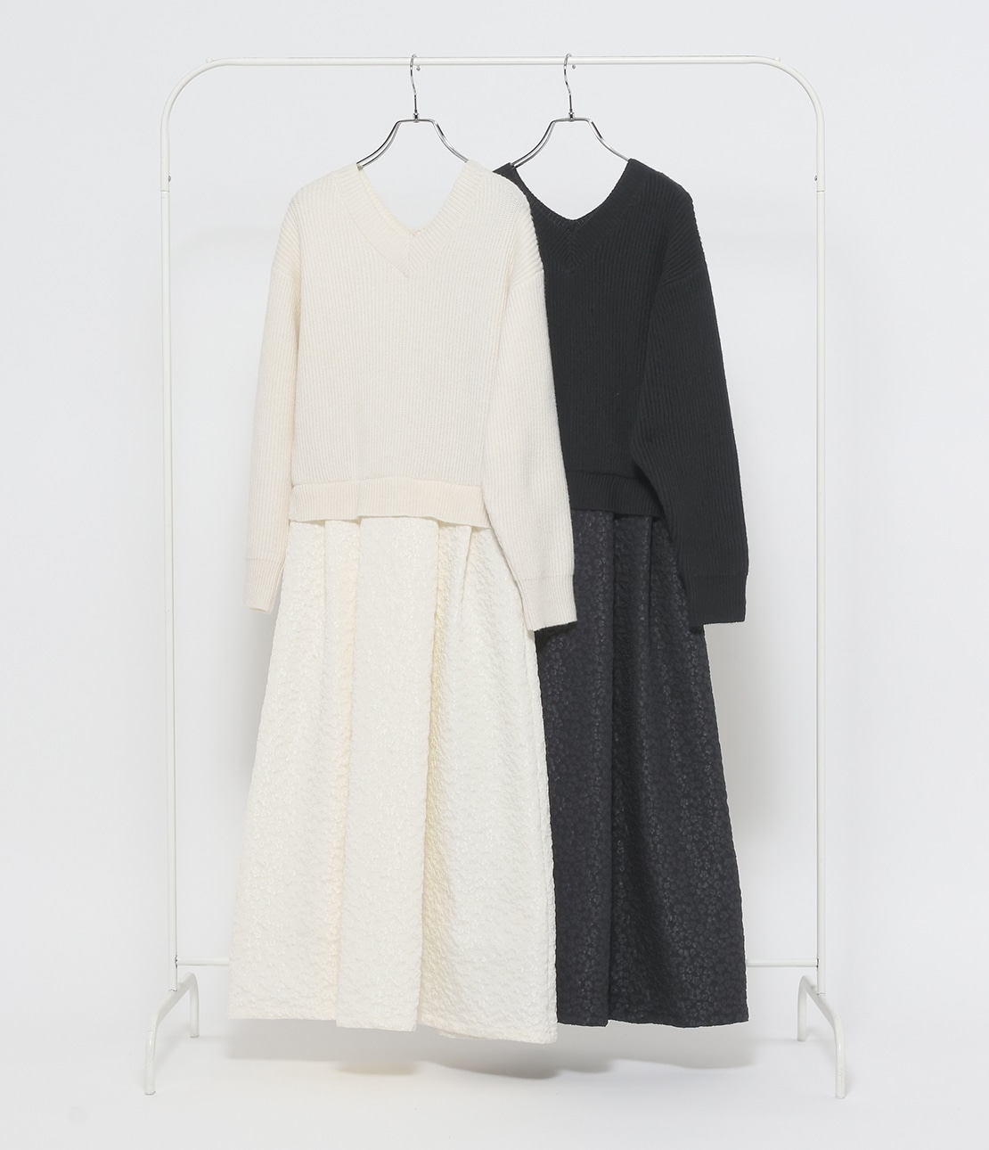 ニットもスカートも同系色で統一感があり、畦編みや小花ジャカードで1枚でコーディネートが完成されるアイテムです。