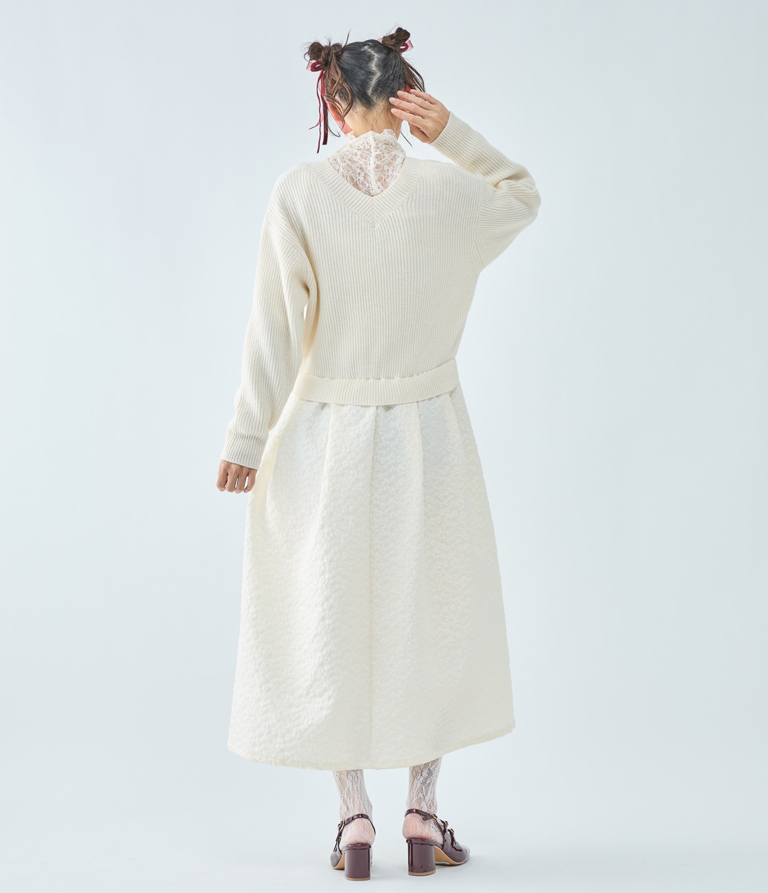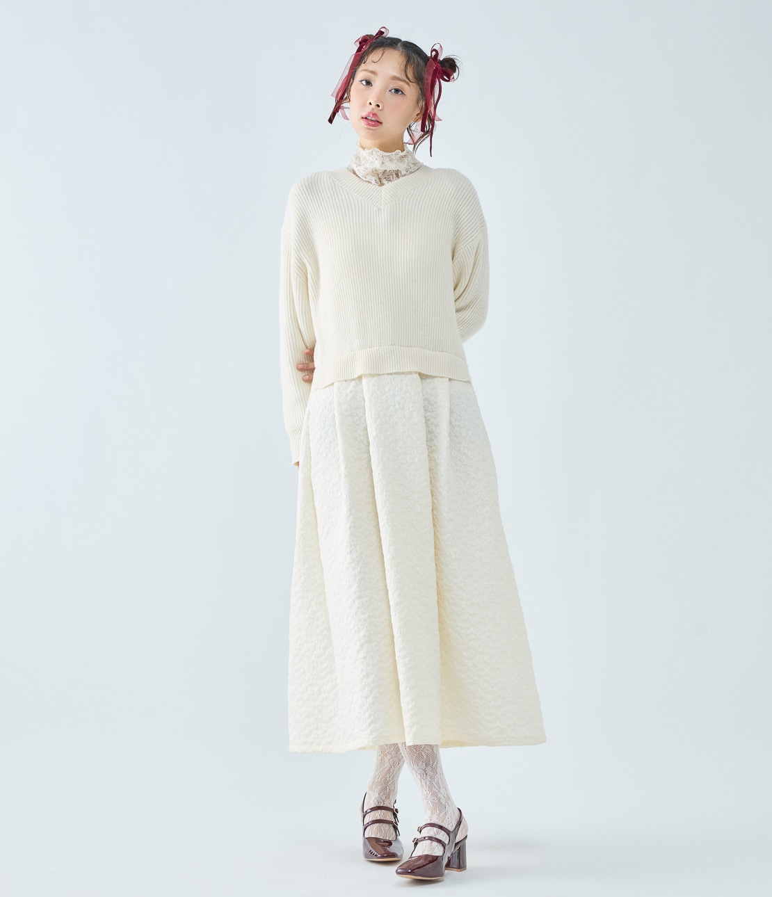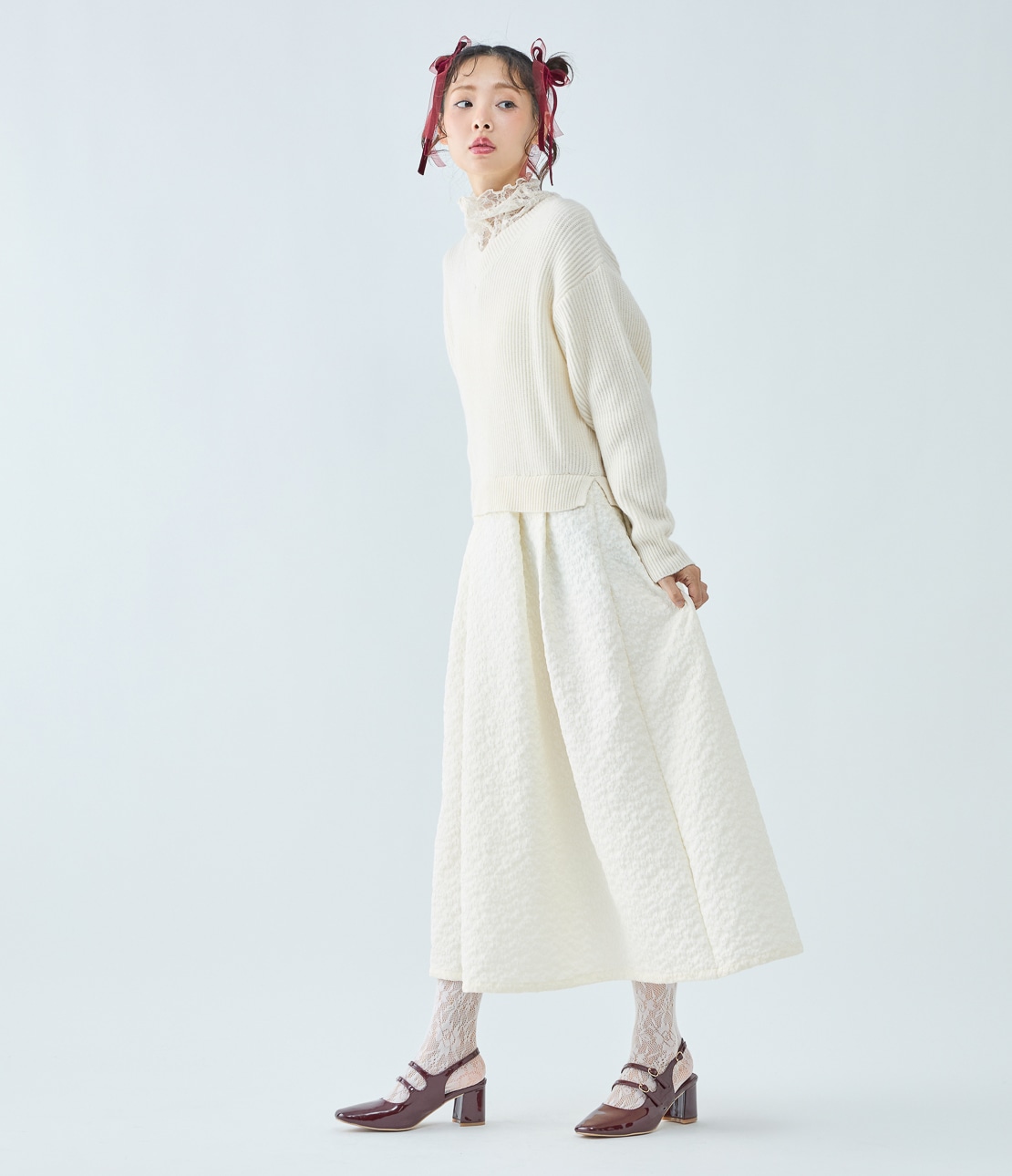スカートはボリュームのあるフレアシルエットで華やかな印象に。