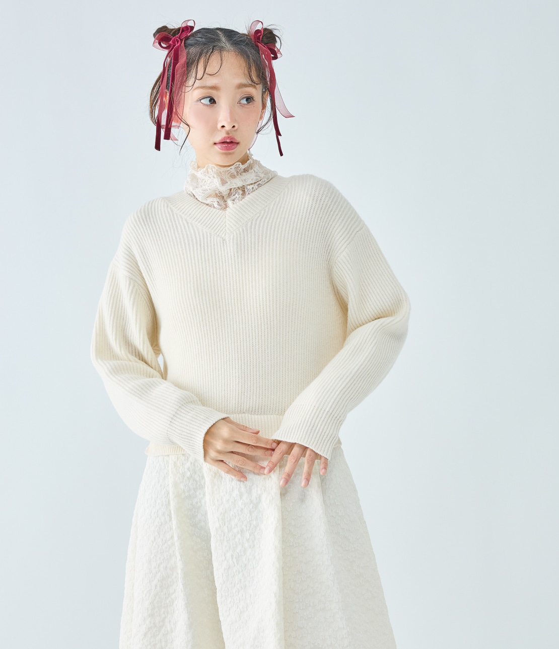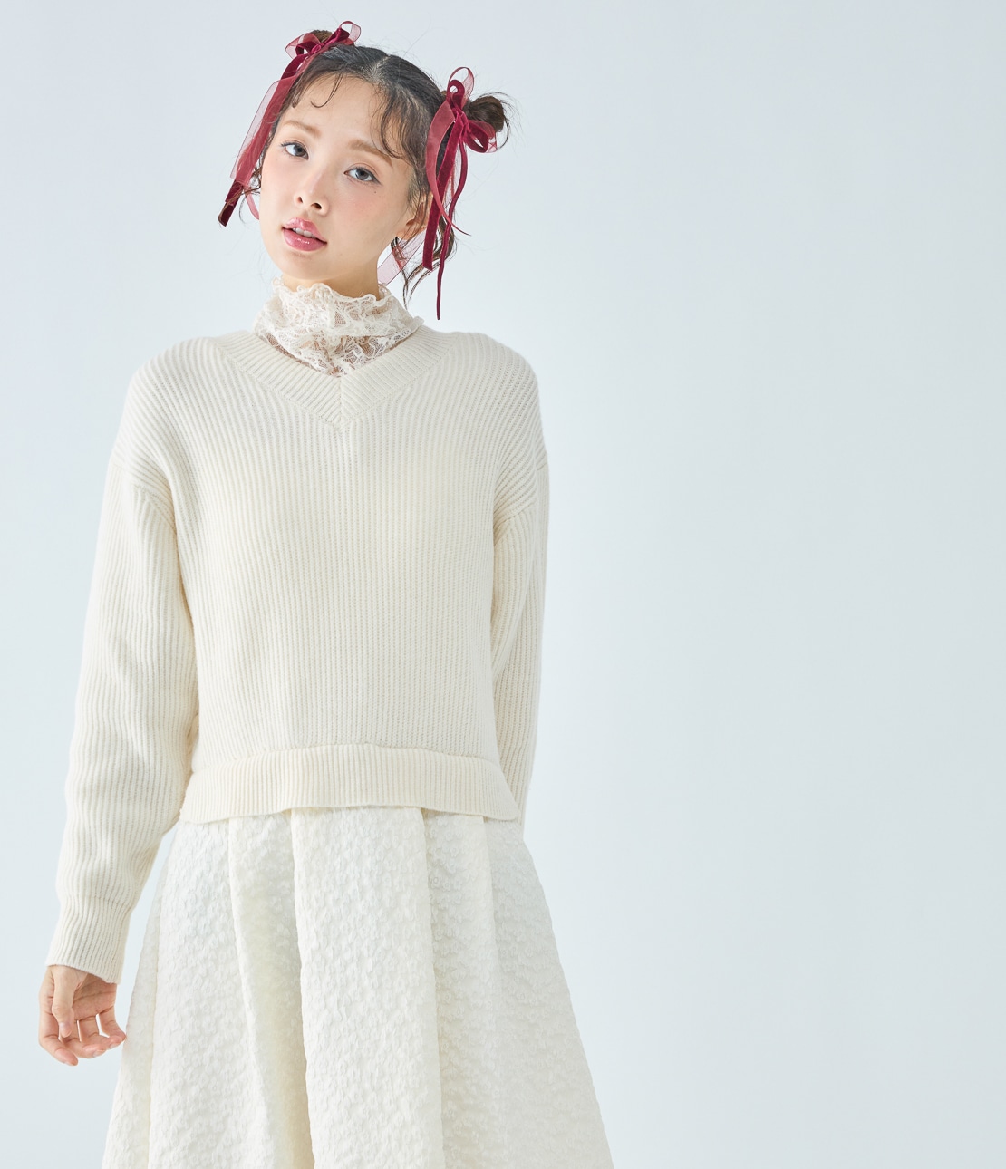 ニットはゆったりめなサイズ感でウエストが絞られたデザイン。