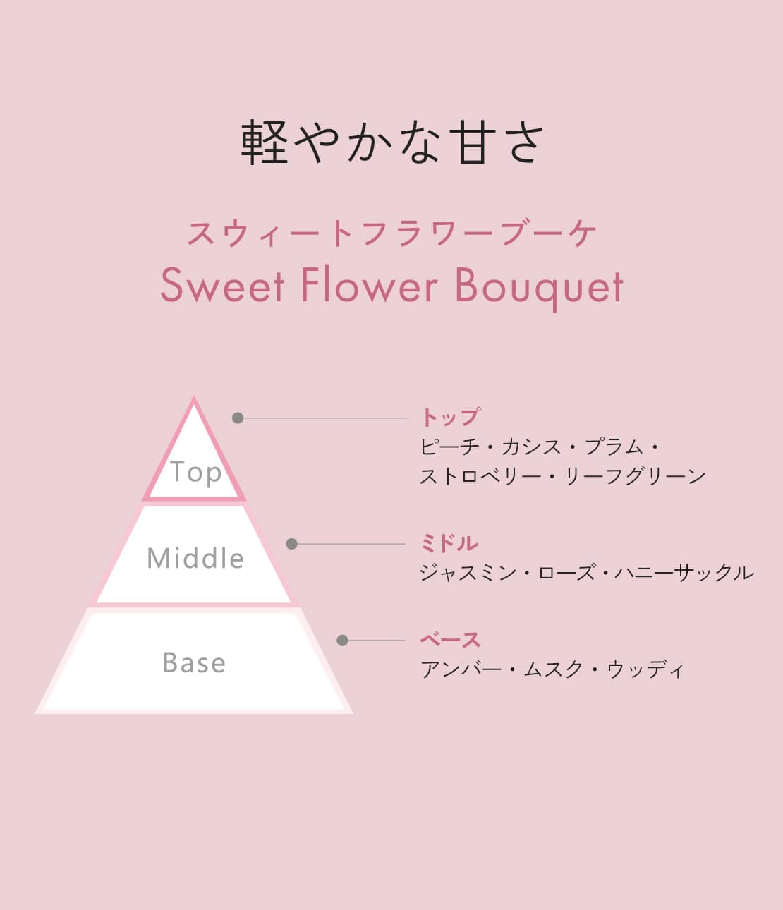 パウダリーなフローラルノートを基調に、みずみずしい花々が優雅な雰囲気を演出