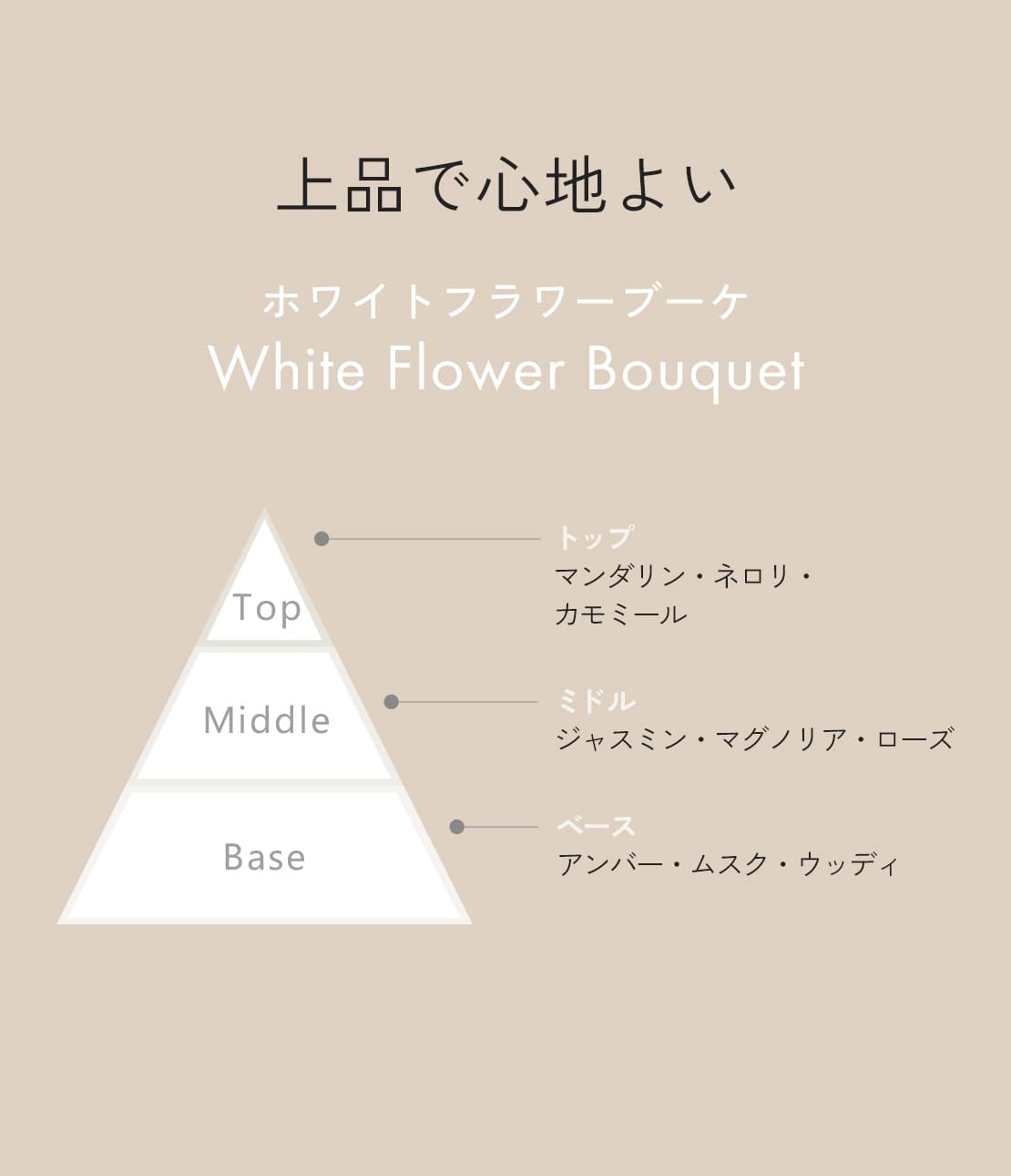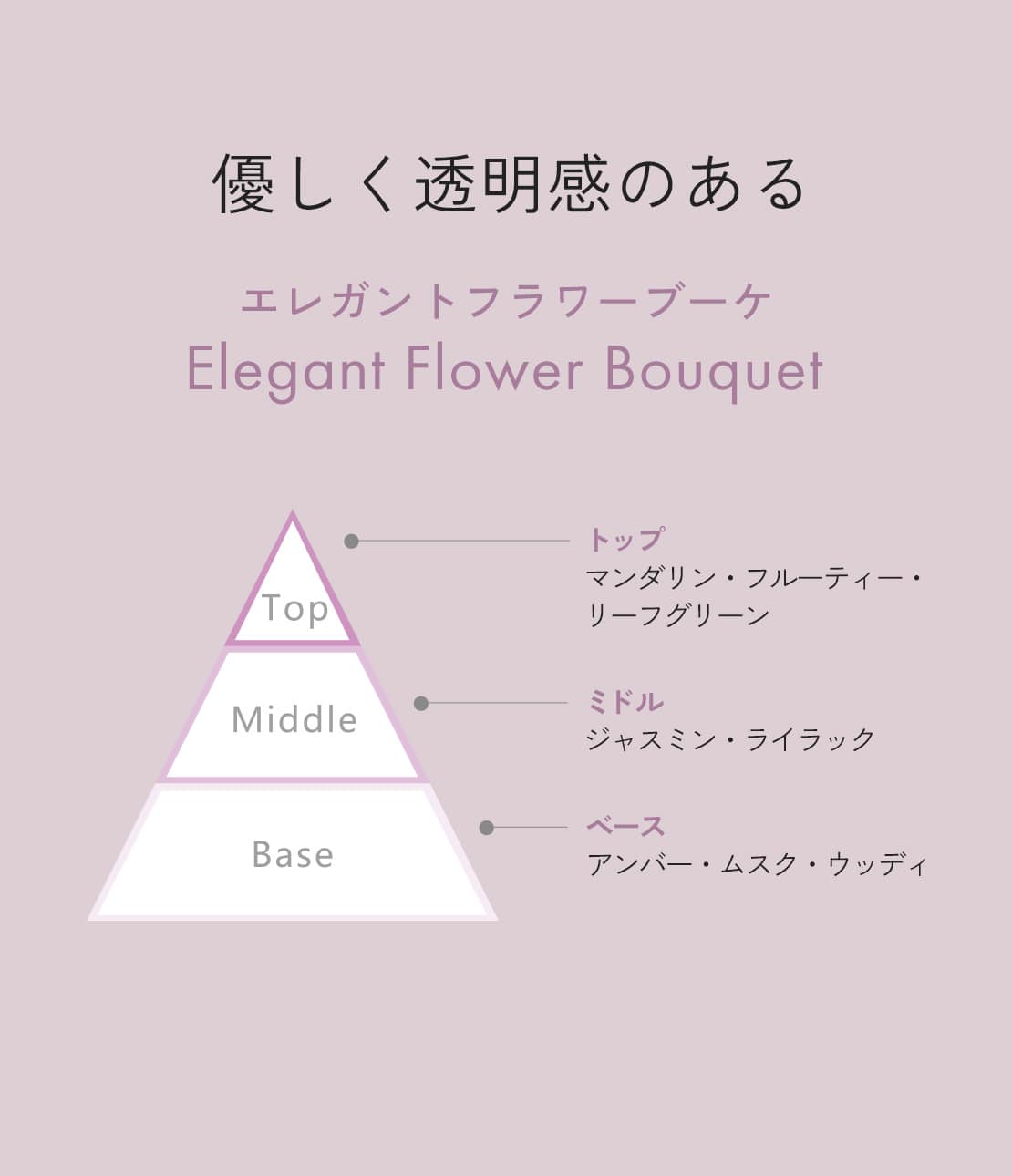 ジャスミンやライラックが溶け合い、エレガントでありながらモダンで洗練された、優しく柔らかく、心地よい透明感