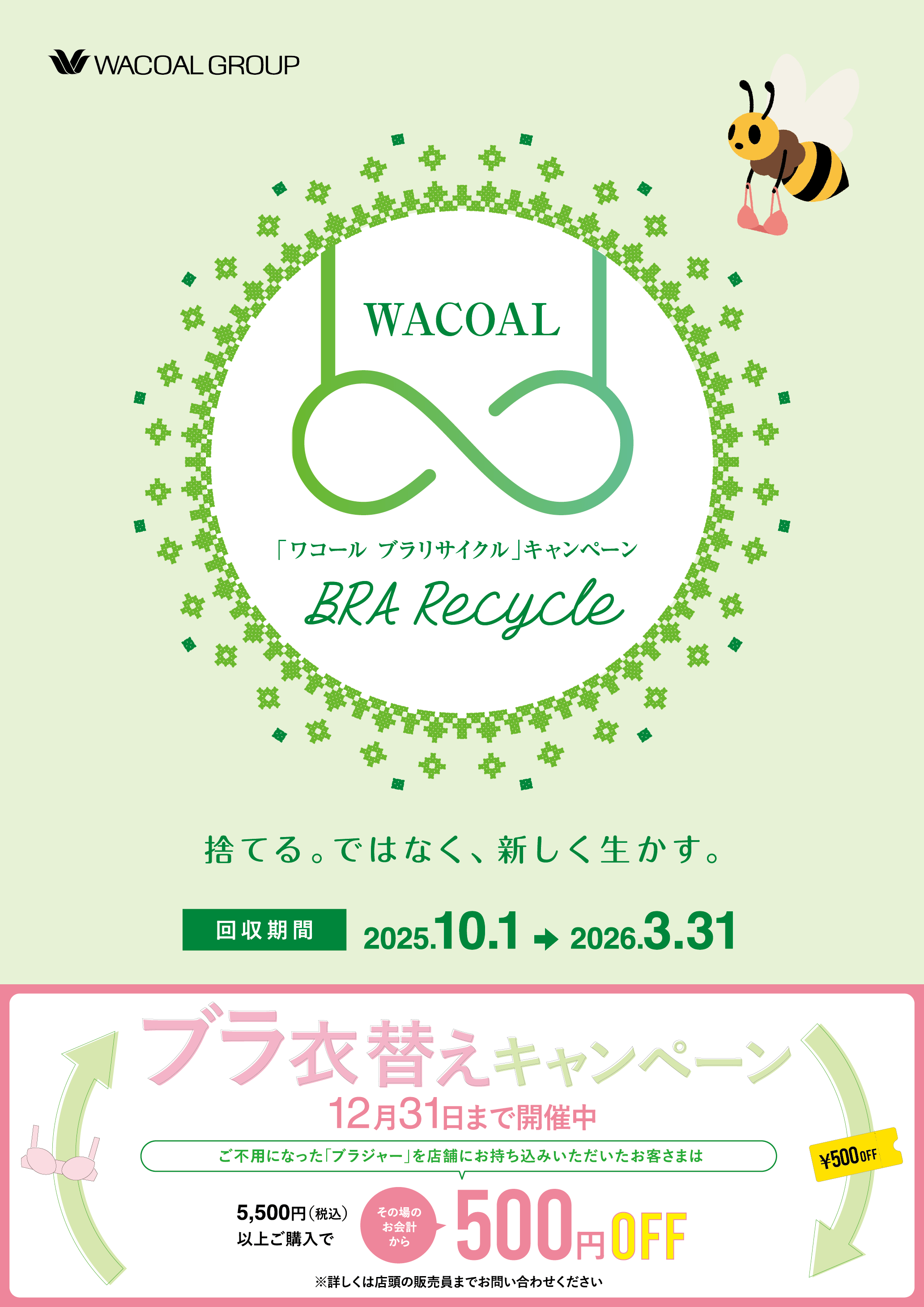 さらに、12/31(水)までの期間限定で、ご不要なブラジャーをストアにご持参いただくと、 5,500円(税込)購入でその場のお会計から500円OFF!